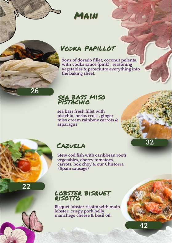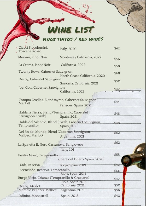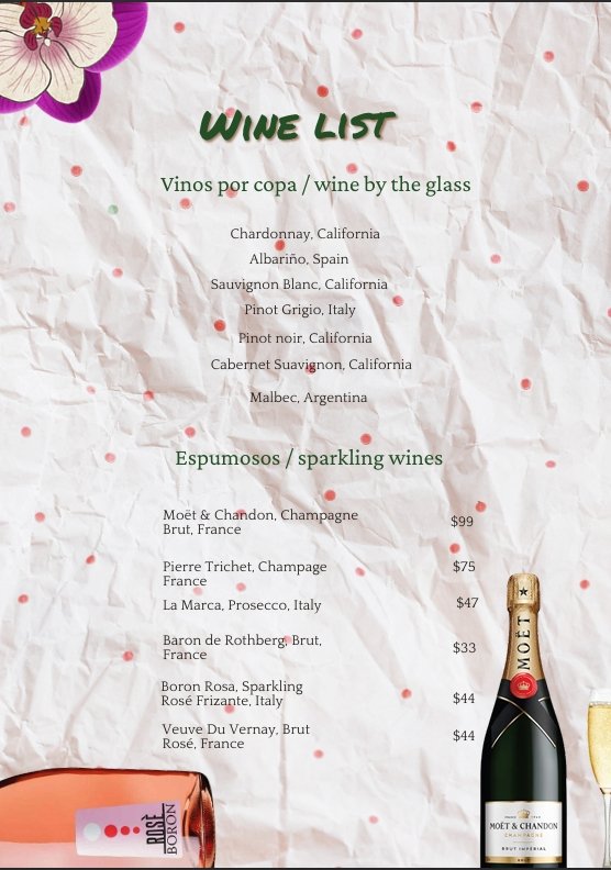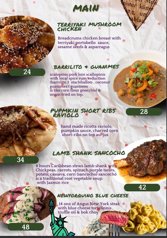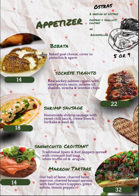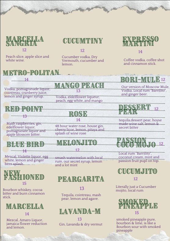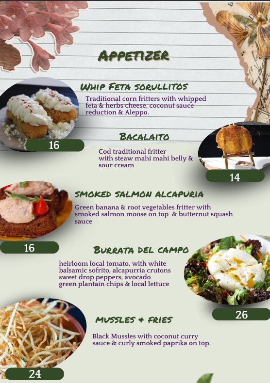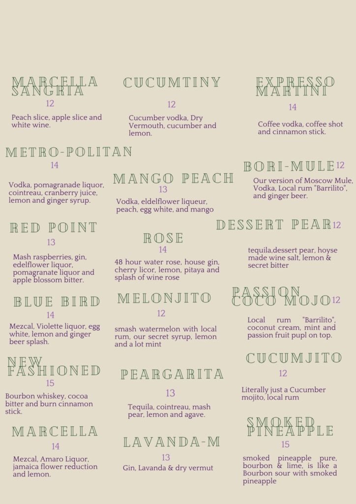 Menu Our Menu Signature Peargarita Tequila, cointreau, mashpear, lemon and agave. 12.00 Reservation Book A Table Now Telephone Reservations 787-463-1403 Facebook Instagram